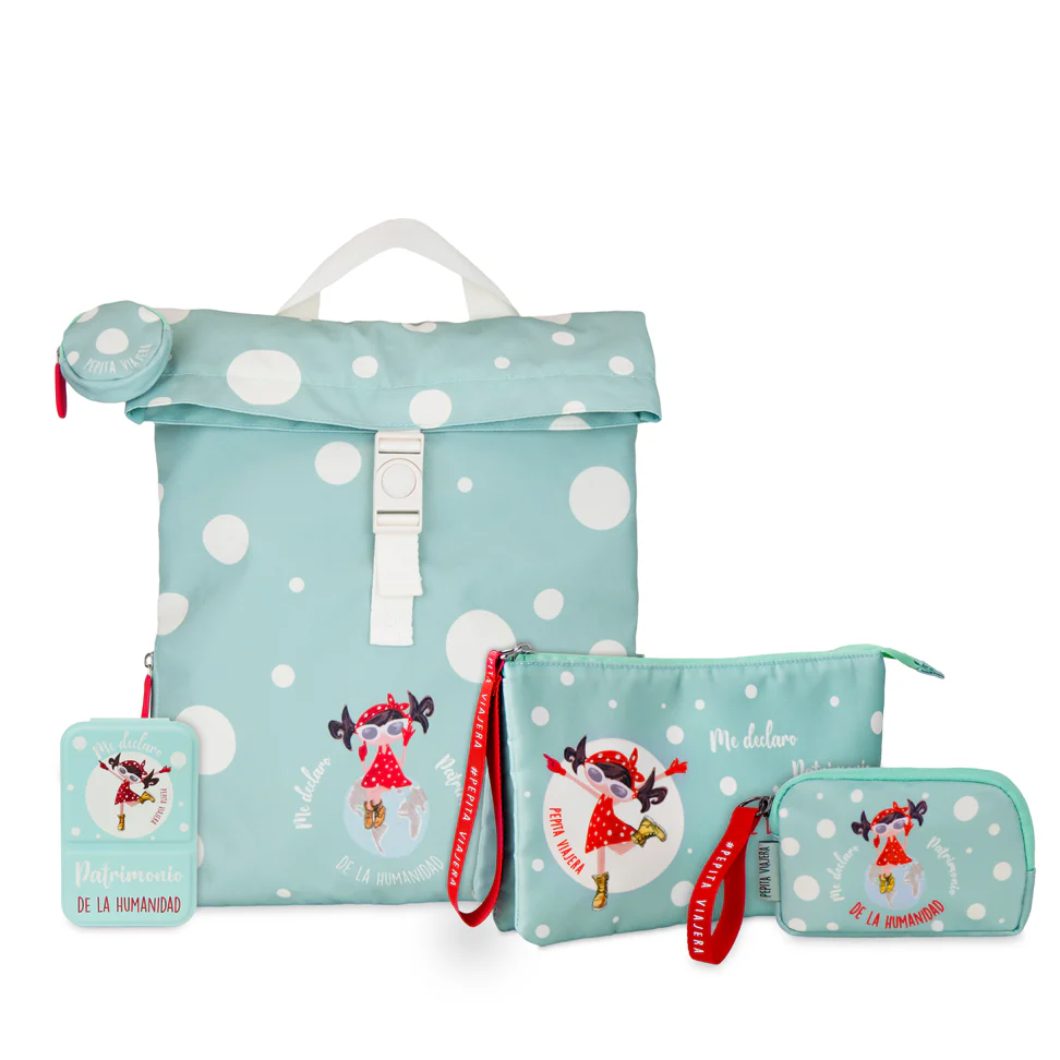 Este pack incluye una mochila ligera y resistente, hecha con materiales reciclados (RPET), perfecta para acompañarte al trabajo, al cole o a tu próxima aventura cultural. Su diseño funcional incluye cremallera superior, bolsillo interior y correas ajustables para adaptarse a cada viajero o viajera. A juego, un monedero redondo complementa el conjunto, ideal para llevar lo esencial con estilo.