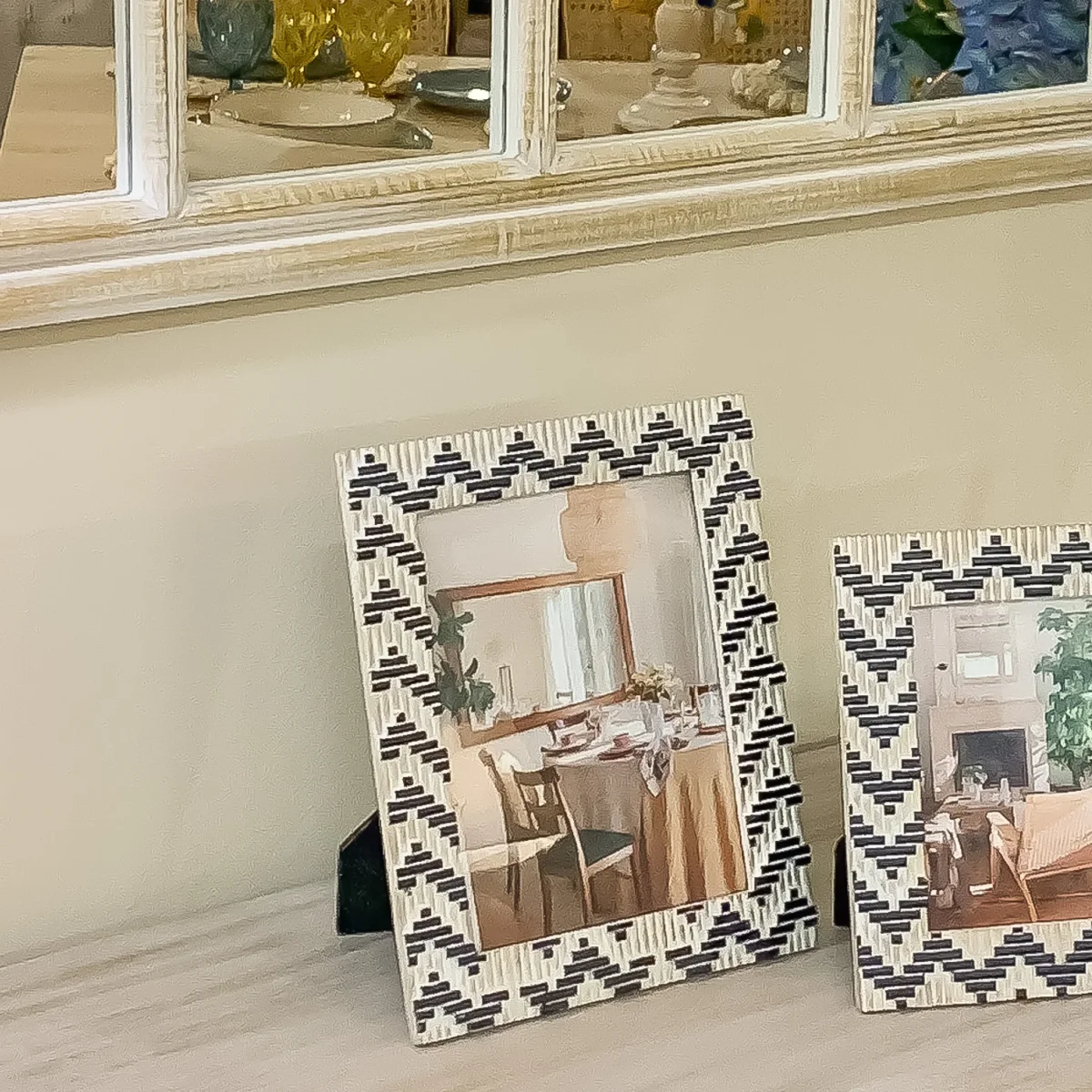 Un portafotos blanco y negro con estampado geométrico. Ideal para estilos étnicos y boho. Un marco de fotos de 13×18 blanco con estampado geométrico negro en relieve. Un marco de fotos de madera con estampado en relieve en forma de zigzag. Combínalo con el tamaño de 15×20 y enmarca tus recuerdos a la vez que decoras tu hogar.