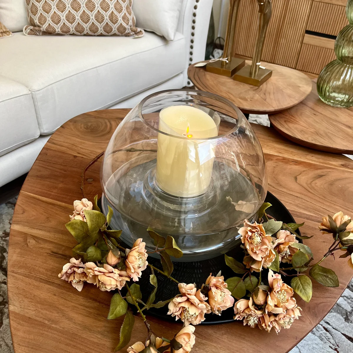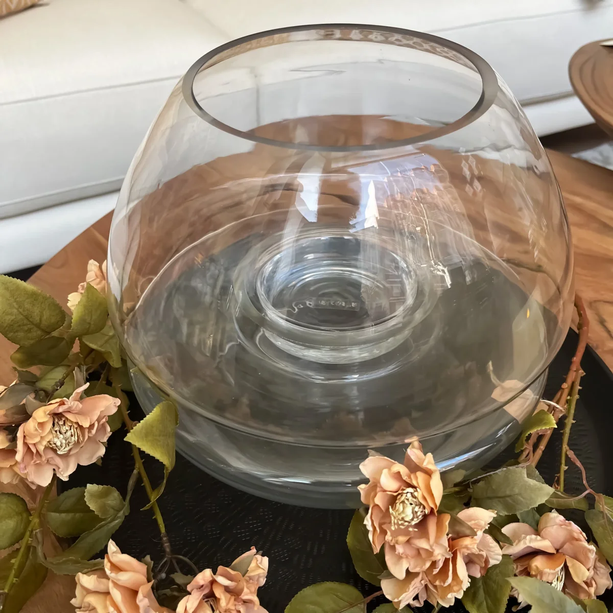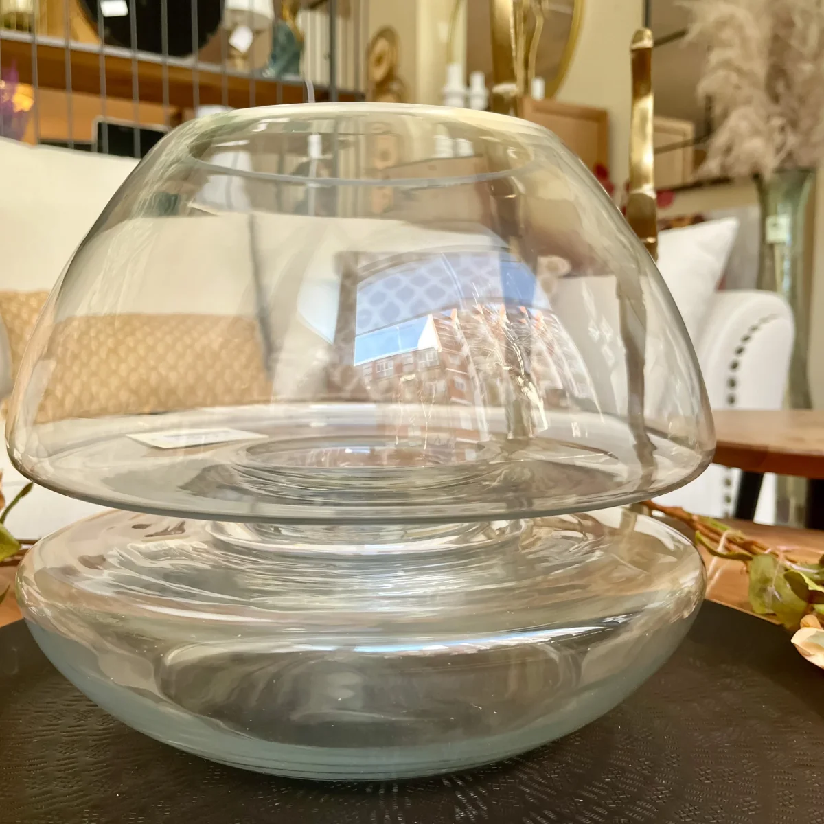 Un portavelas de cristal redondo de 27×33 cm perfecto para decorar tu mesa de centro, la entrada de tu casa o cualquier rinconcito de tu hogar. Añádele flores, hojas o piedras para darle un toque personal. La vela no está incluida.