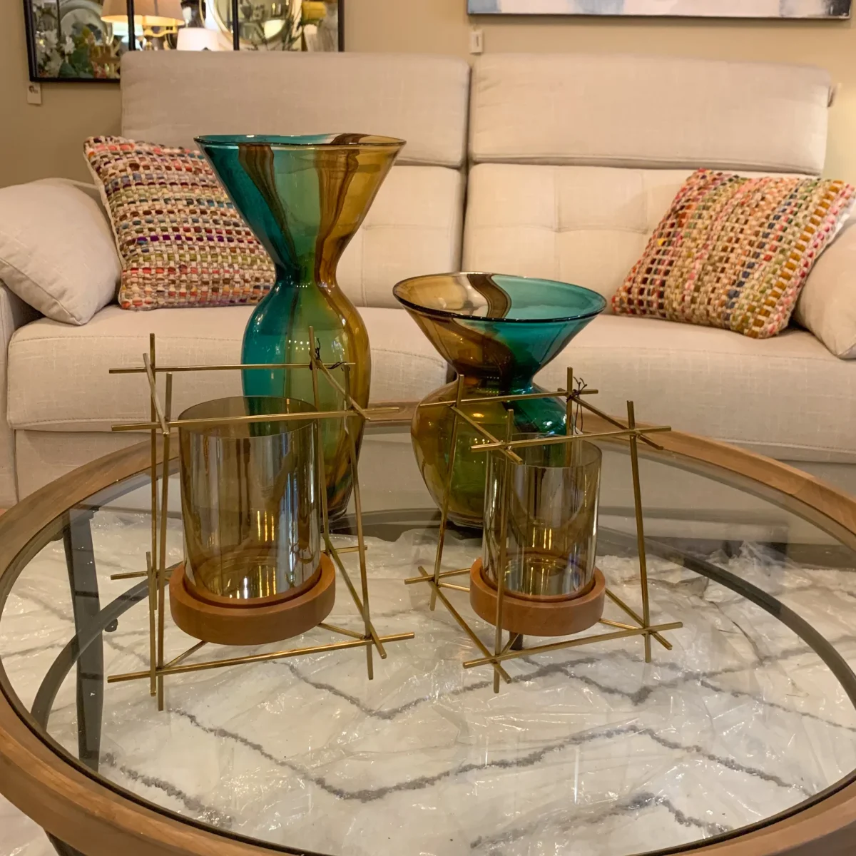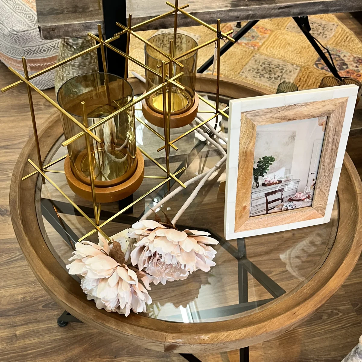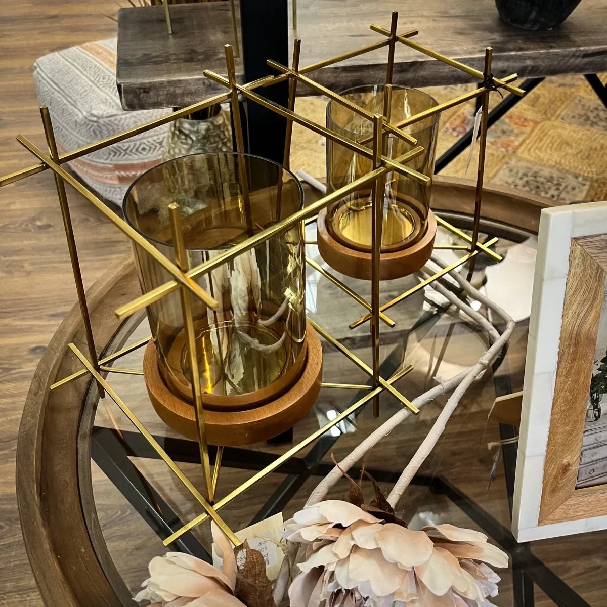 Decora e ilumina de manera original e íntima gracias a este portavelas con estructura base en metal, madera y cristal. Un portavelas dorado y madera con mucho estilo y personalidad.