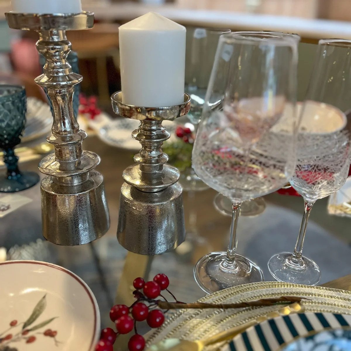Un portavelas plateado de metal con base ancha y detalles intermedios. Disponible en tres tamaños. Combínalo con los tamaños 26 y 37 cm