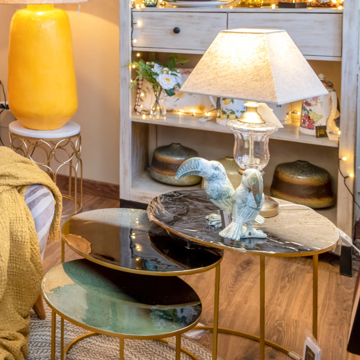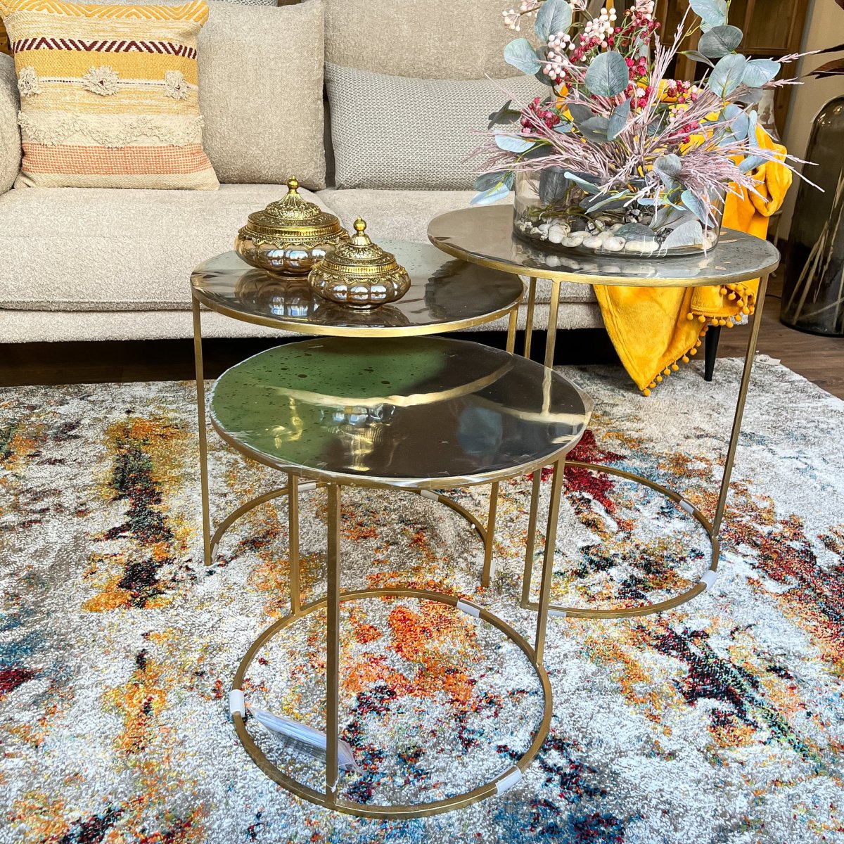 Nuestro set de tres mesas desur red es un conjunto compuesto de tres mesas nido verde y dorado. Unas mesas auxiliares originales y distintas que atraerán todas las miradas y aportarán un toque de personalidad y estilo a tu salón o comedor. Mesas nido de metal dorado ideales para colocar en un rincón de lectura, como mesas de centro o en un rincón de tu dormitorio.