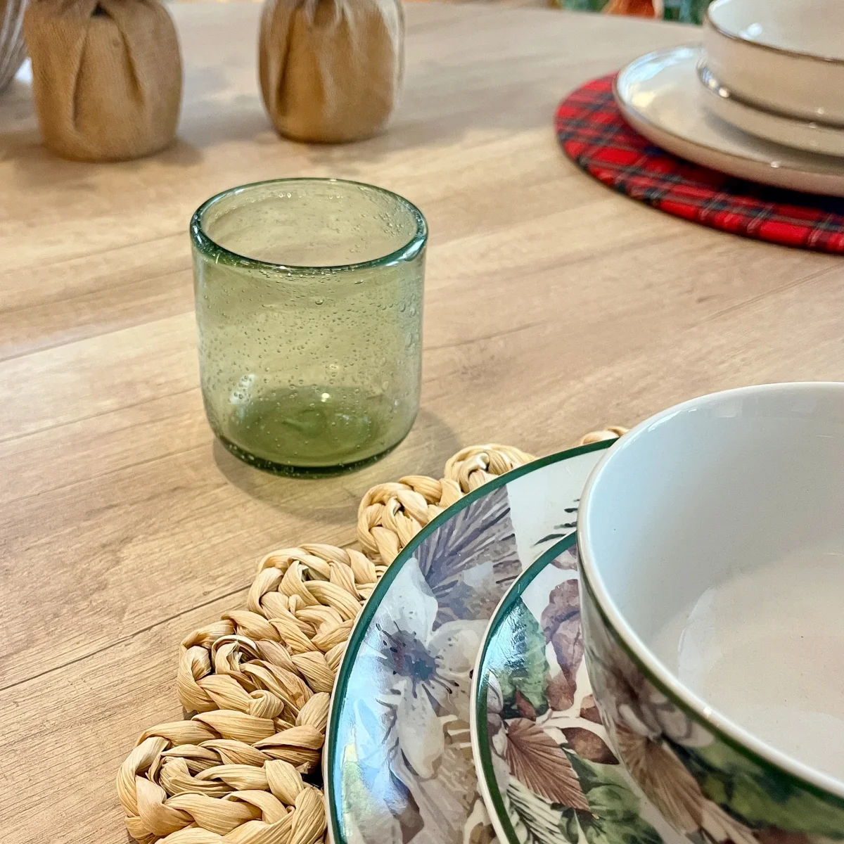 Este set de seis vasos tiene un diseño de líneas sencillas pero con un carácter distintivo. Unos vasos de cristal verde que destacan por sus delicadas burbujas incrustadas, que le aportan un encanto artesanal. Su diseño minimalista y su tono fresco los hacen perfectos para mesas con un aire natural y desenfadado. Ideal para quienes buscan piezas originales y versátiles que combinen funcionalidad y estética. Combínalas con las copas a juego para tener una mesa de revista. Tiene un volumen de 320ml