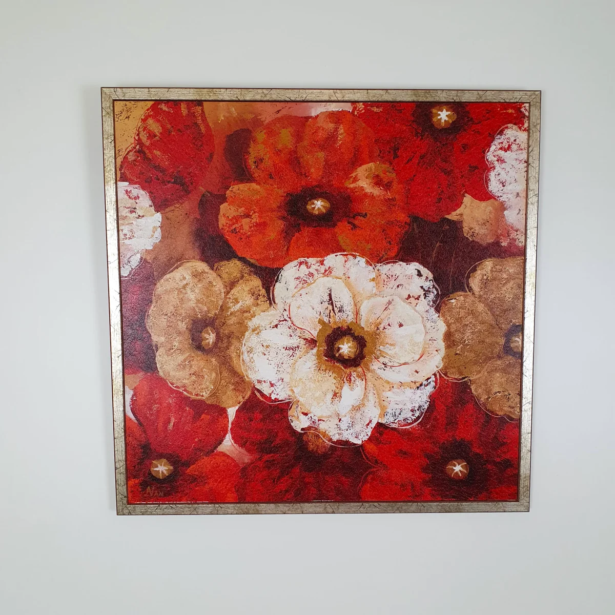 Un cuadro lleno de color y vida con el que decorar las paredes de tu hogar. Un cuadro de flores rojas, blancas y doradas con marco dorado. Ideal para ambientes rústicos, vintage, clásicos o rústicos. Colócalo en la cocina, salón o entrada y llena de vida y color tu hogar.