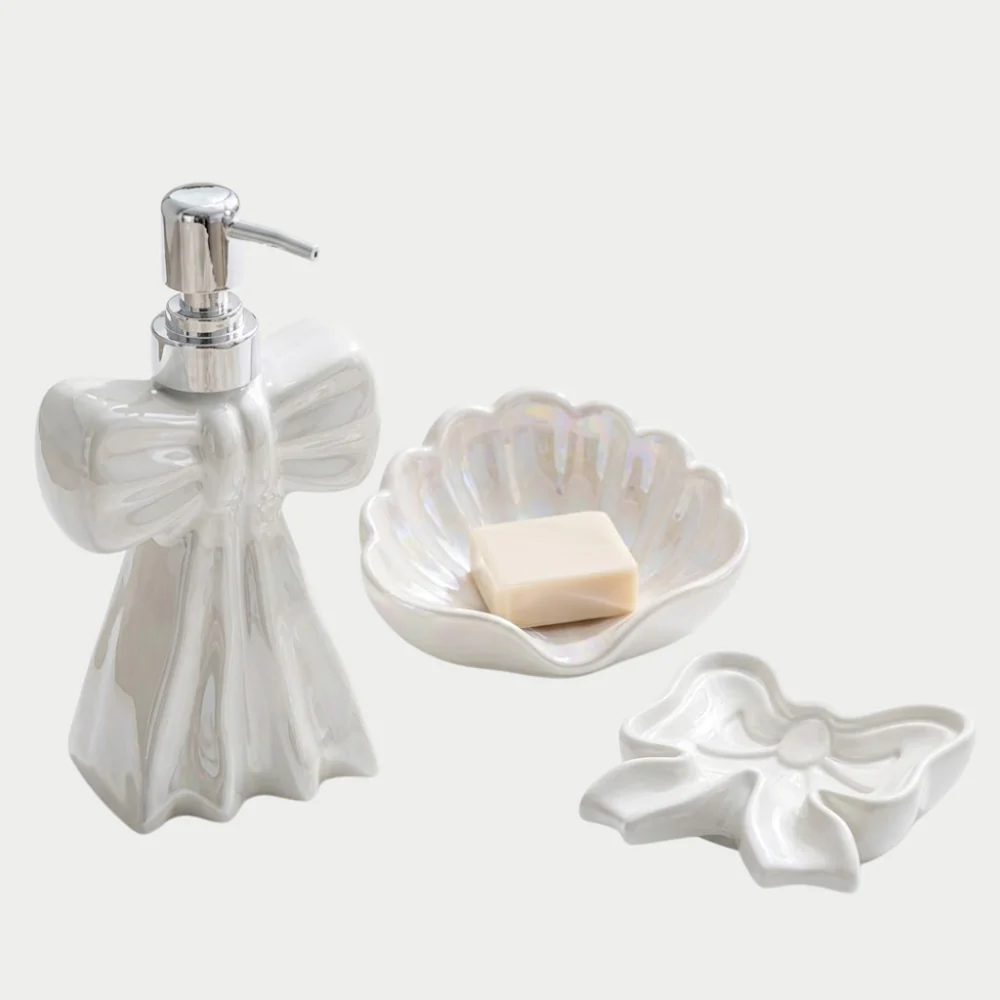Conjunto de tres accesorios funcionales para tu baño en color blanco. Incluye piezas con diseño elegante en forma de lazo que añaden un toque decorativo a tu espacio. Perfectos para organizar y mantener tu baño ordenado mientras complementan cualquier estilo de decoración. Fabricados con materiales duraderos, estos accesorios combinan practicidad y estética en un solo set.