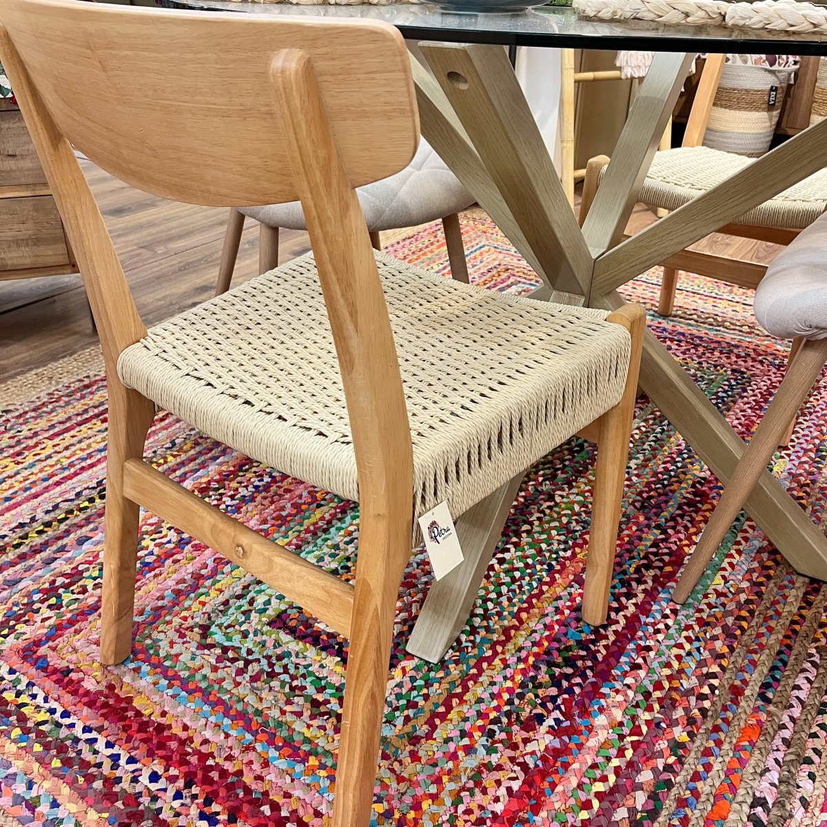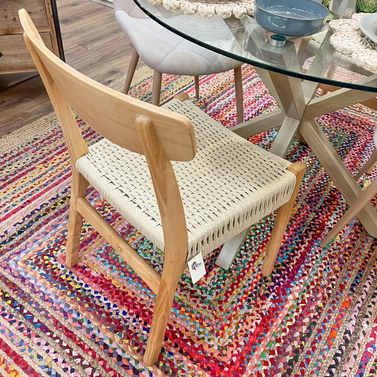 Esta silla combina la calidez de la madera de Hevea con la resistencia de las fibras sintéticas en su asiento trenzado. Su diseño natural y versátil encaja a la perfección en comedores, cocinas o incluso en espacios exteriores cubiertos. Con unas medidas de 48×78 cm es una opción cómoda y decorativa para tu hogar.