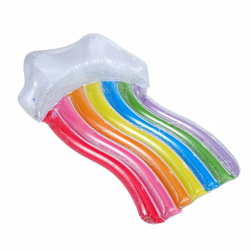 Comodidad que brilla con todos los colores. Este sillón inflable con diseño arcoíris es perfecto para relajarte en el agua con estilo. Su forma envolvente y su diseño colorido lo convierten en el protagonista de cualquier piscina. Ideal para tomar el sol, descansar o disfrutar de una bebida flotando.