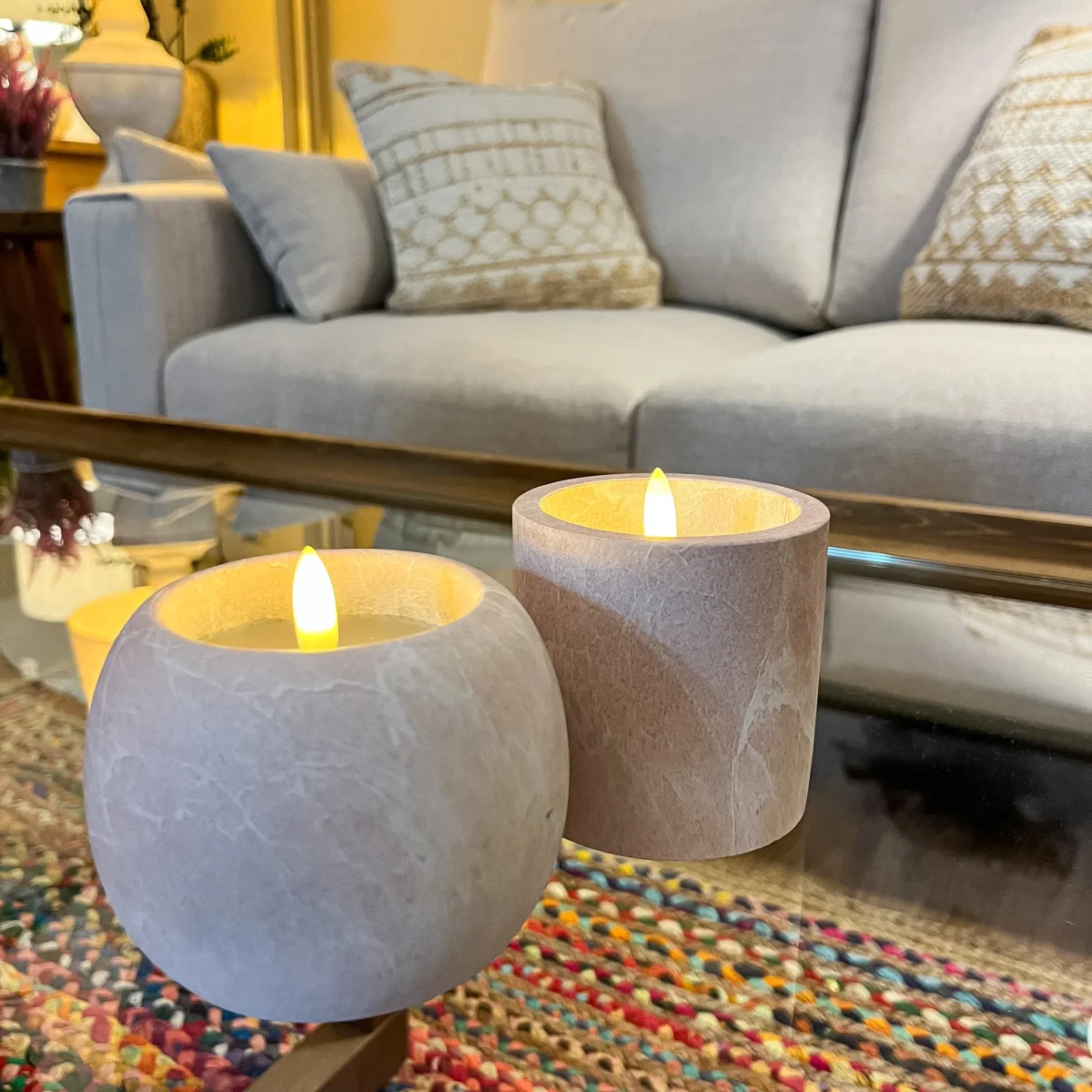Una vela decorativa color rosada con vetas blancas ideal para colocar en cualquier espacio y aportar esa calidez y estilo. Una vela led de cera y cemento de forma redondeada de 10x10x8 perfecta para cualquier rincón. Disponible también en color marrón.