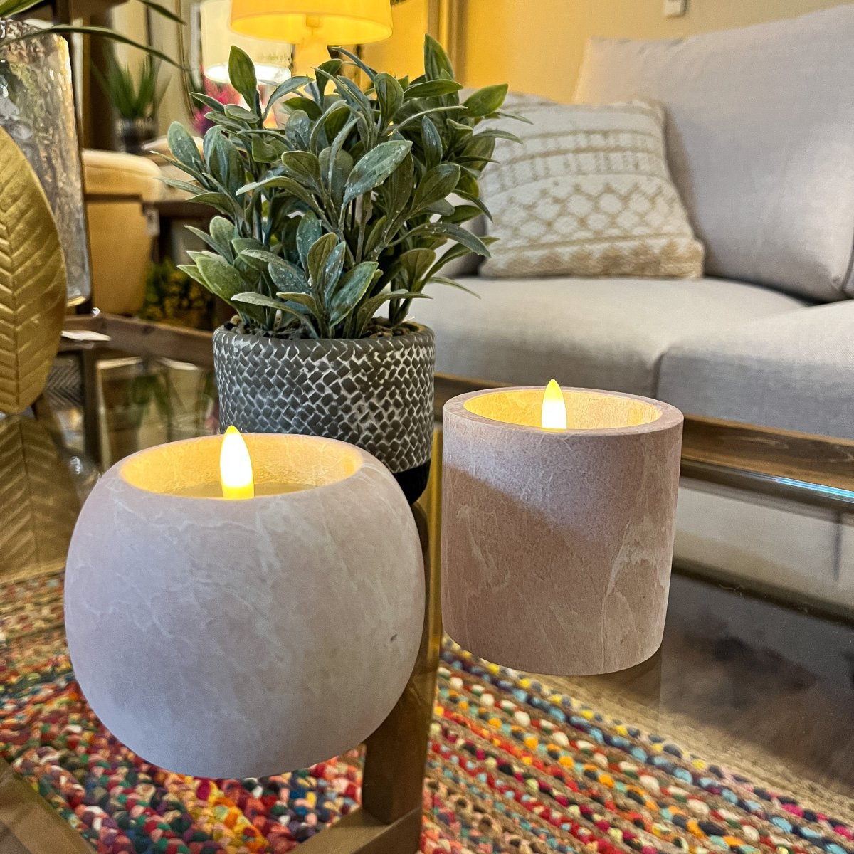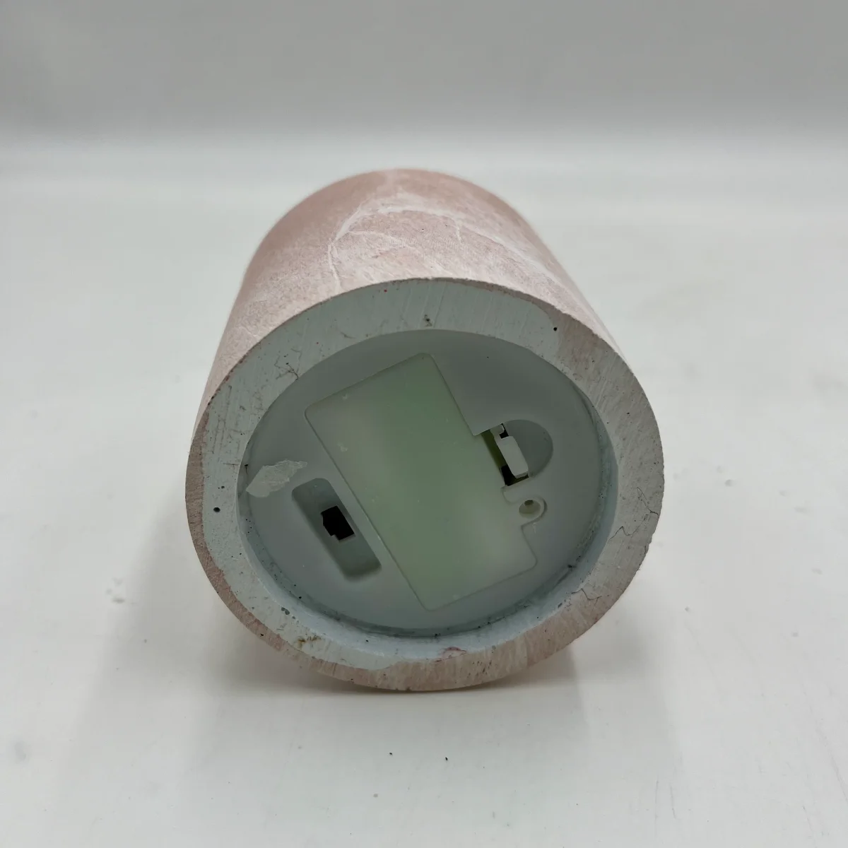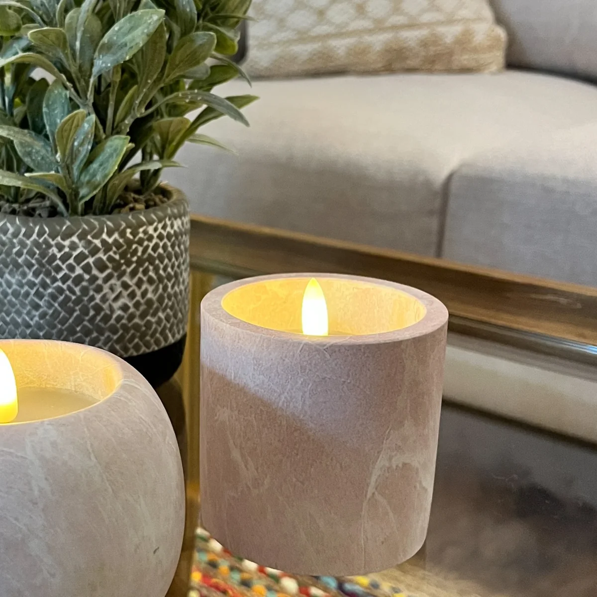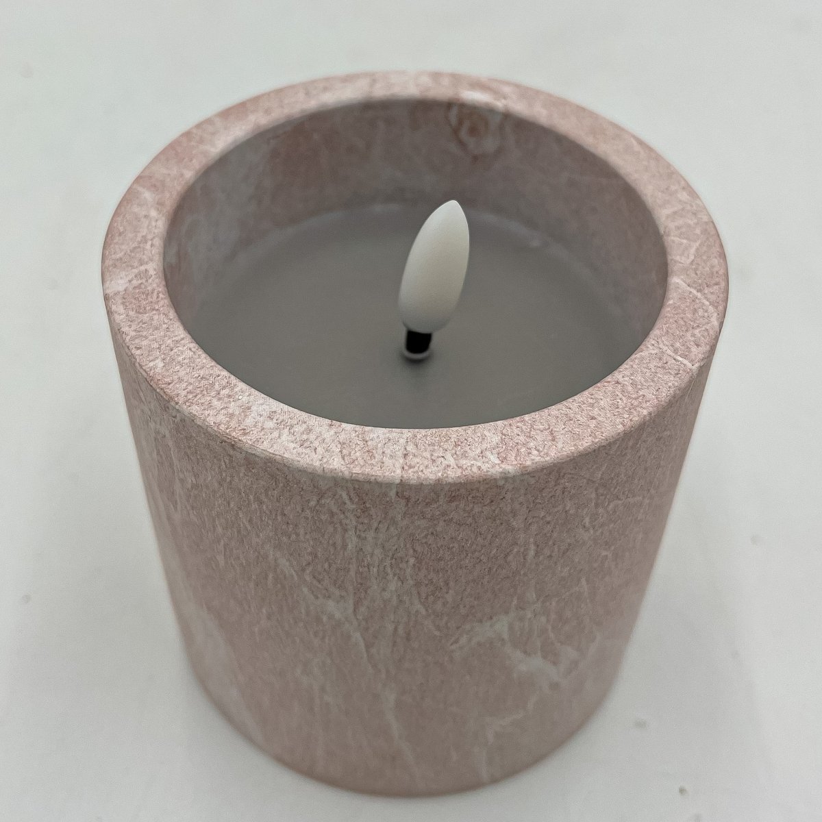 Una vela decorativa color rosada ideal para colocar en cualquier espacio y aportar esa calidez tan deseada. Una vela led de cera y cemento con vetas en blanco de 8x8x9 perfecta para cualquier rincón. Disponible también en color marrón.