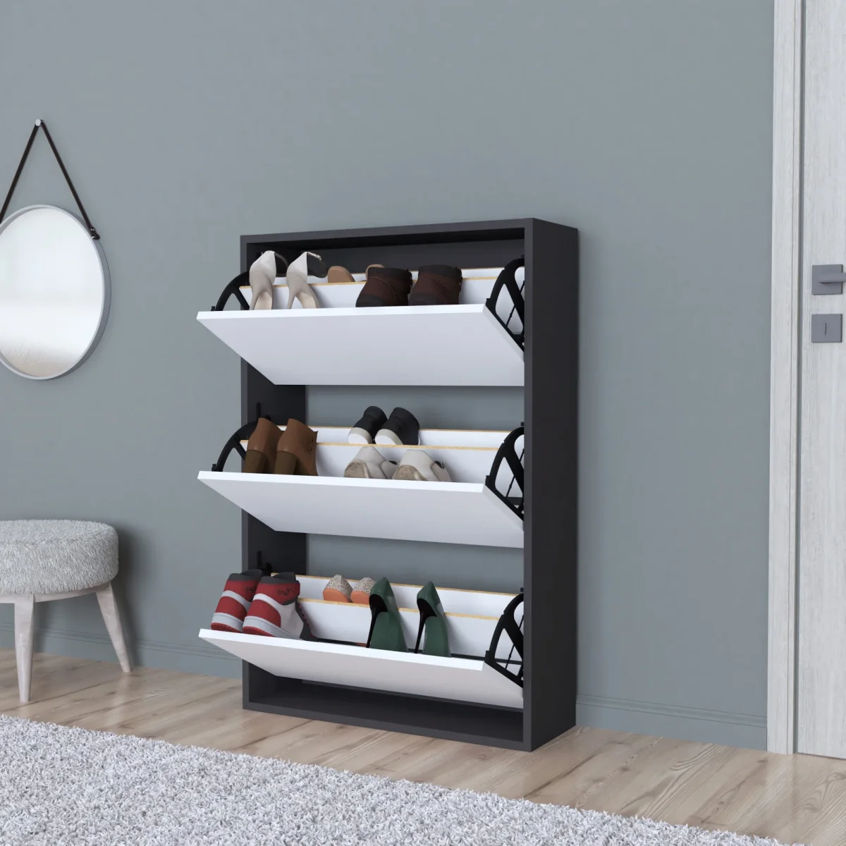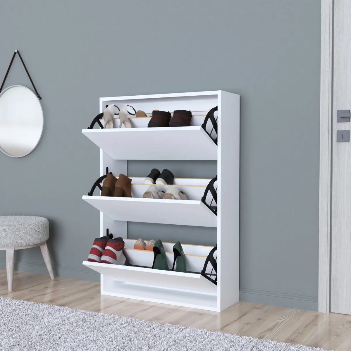El moderno zapatero abatible cuenta con tres puertas abatibles y le ofrece la solución ideal para almacenar sus zapatos de forma que ahorre espacio. Con su diseño atractivo, se convierte en el centro de atención en cualquier habitación.